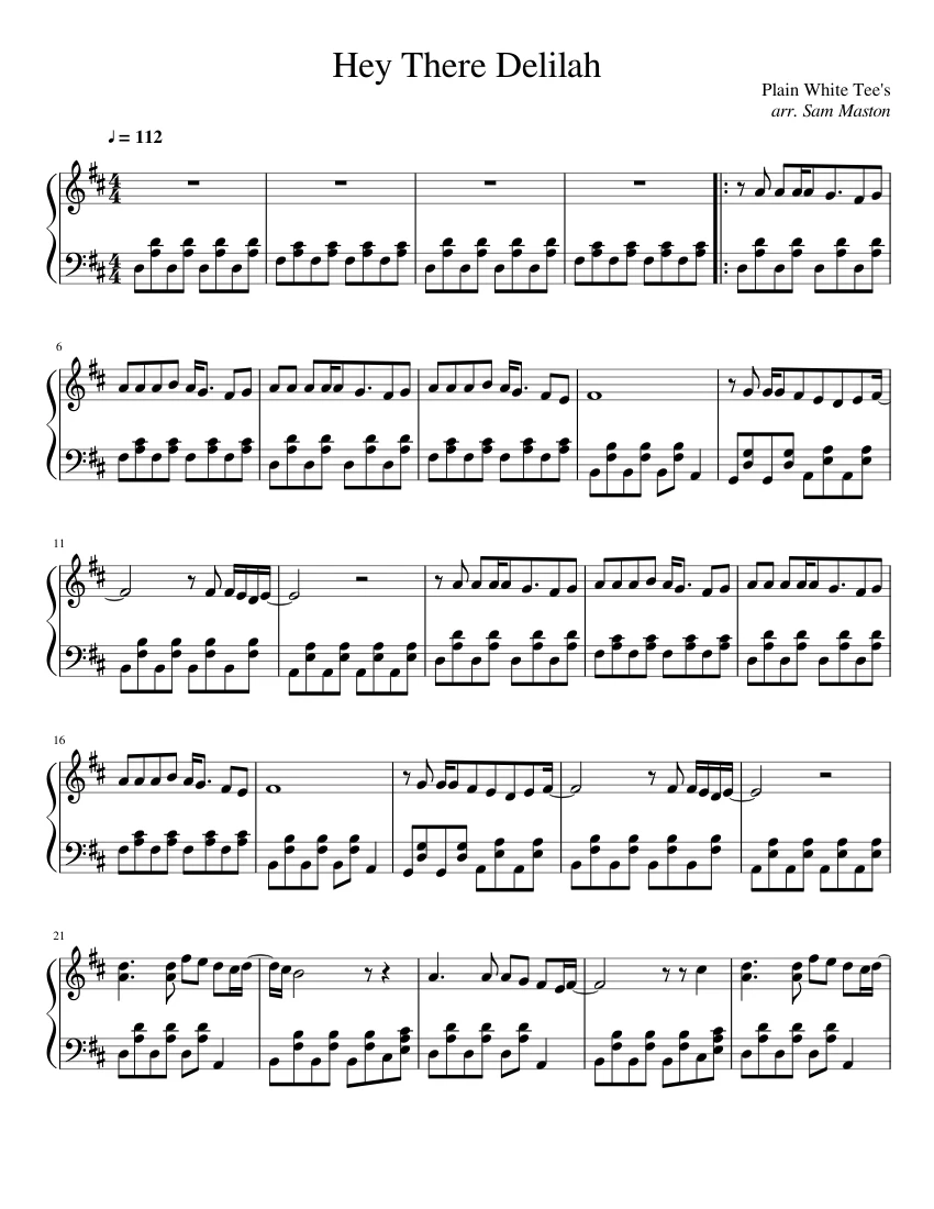 Hey There Delilah Plain White T S Sheet Music For Piano Download