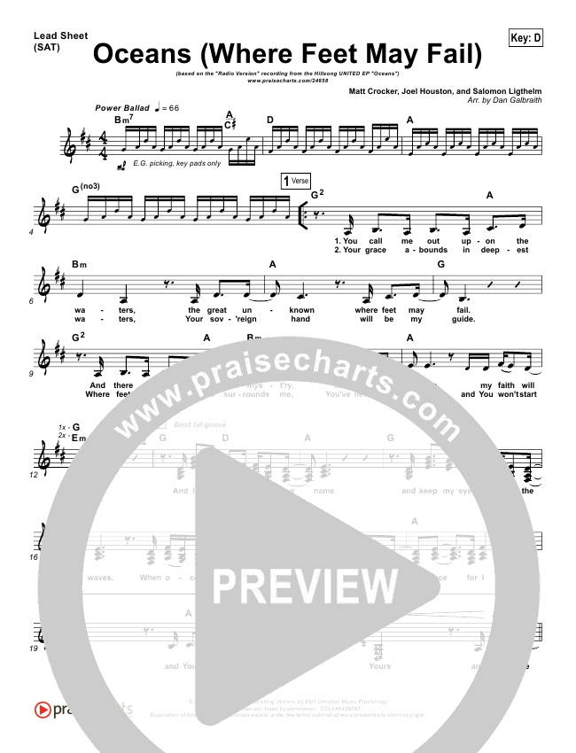 Oceans Where Feet May Fail Radio Version Lead Sheet Piano